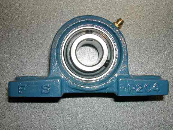 Below is the 20 mm self aligning plumbers block bearing used to support the tumbler shafts. Note the two grub screws for locking the shaft to the bearing and the brass grease nipple for lubrication purposes. These bearings can be obtained from specialist bearing supply companies.
