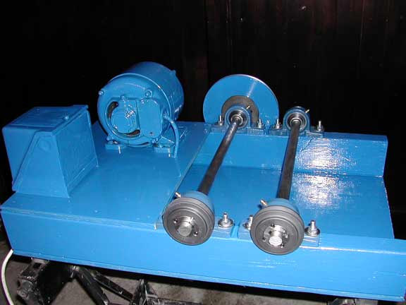 All pulleys were secured to the shaft ends and the tumbler was given a coating of protective paint. When dry, the electric motor with a speed of 1425 rpm was fitted along with a 2 inch pulley. The next pulley in line was 7 inches in diameter and fitted to the first 20mm shaft. On the opposite end of the shafts were fitted two, 3 inch pulleys One drove the second shaft at the same speed as the first. The square shaped box on the left of the photo houses the motor on/off buttons etc.