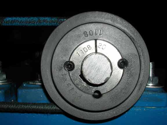 Below is a close-up of the taper-lock mechanism used with my pulleys. These are independent pulley hubs which can be changed according to the shaft size used. They lock the hub, shaft and pulley together. These pulleys were obtained from a specialist bearing company.