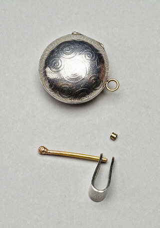 Install a bail loop. Mark a point on the top center of the back piece of the locket case. Separate the locket case, and set the front piece aside. At the mark on the top of the back piece, file a small groove perpendicular to the back piece where the bail loop will go. Place the back piece, flat side down, on your soldering pad. Place a 3mm ID jump ring into the groove, and solder with easy solder. Quench, pickle, and rinse it. Install a friction-clasp pin. On the bearing plate of the back piece, directly opposite the hinge, mark a point halfway between the inside edge of the bearing plate and the outer edge. At that point, drill a 1.0mm hole through the bearing plate only. Sweat a small bit of easy solder onto the end of 18-gauge (1.0mm) sterling silver wire. Cut off a 5mm (3/16-in.) piece. Use flatnose pliers to force the soldered end into the hole until it touches the inside of the dome. Hold the back piece in cross-locking tweezers. Flux and heat it with a large, soft flame until the solder on the wire flows. Quench the back piece, check your solder joins for security, and pickle.
