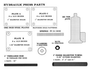 Everything needed to assemble the press is listed, with measurements, in the parts diagram (Diagram 2). The size of this press has proven useful for making jewelry and small sculpture. Research was done by a machinist to determine the correct thickness for the steel plates, the threaded rod size and the number of nuts needed to withstand the stress of 20 tons. As the press is assembled, level each plate and make sure that they are all parallel. Also, it helps to grease the tubing in the areas where plate B slides.