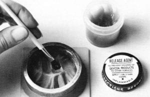 Stick the model to a flat base of glass or plexiglass that is at least 1 inch larger in all directions. Then place a cleaned section of steel pipe around it to act as a retaining ring. The model can be as close as ⅛ inch to the ring, and as close as ¼ inch to its depth. More than ¼ inch in either direction is unnecessary and wastes material. The ring should be filed so that the edges are flat and parallel. Next, put some plasticene around the outside of the ring to stick and seal it to the flat base. Then carefully coat the model and base inside the ring with the release agent that is supplied with the plastic steel. Avoid getting it too thick.
