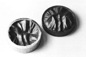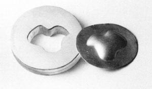 The first step in making a conforming die is to make a model of the form you want to produce. The model could be made of plexiglass, wax, wood, plaster or plasticene. The depth should be about ¼ inch for a 2 inch diameter die. Larger dies could have a deeper relief. Avoid undercuts and sharp bends. Small detail and textures will not be reproduced, but can be added later by chasing. If the die is to be reversible, to produce two matching halves of a hollow form, the model's outline or silhouette must be perfectly symmetrical, and extreme accuracy is necessary.
