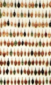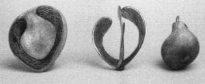 Shari Mendelson uses a number of structural devices for her narrative effects. At a basic level, she reduces elements to pairs, encouraging a dialogue between them. In some cases the elements are mirror images, conversing in their mutual isolation. In other pieces, Mendelson matches a form with its opposite, or several other counterparts, suggesting the necessity for difference in arriving at harmony. In the installations Calendar and Sins, she abandons the structure of sequence for a more complex serial structure. Both of these pieces repeat a single element many times and then these elements are arranged into a grid. The minimal changes from one element to the next encourages a careful reading of the entire piece to find the meaning of the narrative. A grid pattern is another method of recording time, and it is a way to allow the viewer to create his or her own time and order in their perception of the work.