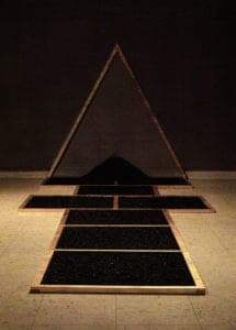 Since narrative often comes out of structures in which one event follows another, as in film or literature, almost any sequence of images is capable of evoking a narrative. It is in this way that narrative can extend beyond representational and figurative imagery, into pure form. Such is the case in the work of Hai-Chi Jihn. In Jihn's work sequencing is sometimes ambiguous: a reading from left to right is as logical as reading from right to left. She may also direct us through a series of visual frames toward a projected goal, as in her sculpture Hopscotch. We move through this work in an immediate, visceral way, jumping visually from grid to grid, recalling our particular memories of this childhood game to which the title refers. Here, as in most work that uses a serial structure, the viewer is an active participant in the unfolding narrative.