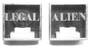 In more recent work, Lins puts text against form, setting up incongruous relationships that prompt open-ended discourse as viewers bounce back and forth between word and image, image and word. Lins confronts us with a dissected syntax in Legal Alien. In the diptych, framed, copper vessels rest formally on pedestals placed in shadowboxes behind glass. The title floats authoritatively and imposingly on the surface of the glass, obscuring our view of the enclosed contents: "LEGAL" conceals a Western style cup and plate, while "ALIEN" shrouds a Greek amphora. Because the two words are separated from each other by the framing device, we examine both the phrase and its separate component parts. In addition we inevitably see the words in relation to the vessel forms. As we flip back and forth we are caught in a narrative suggesting ethnic identity juxtaposed against the myth of our culture as a melting pot. Both of these readings recall the personal and the public experiences of cultural transition. As in her other works that investigate the dynamic exchange between words and image, text spurs an on-going narrative in our minds as we compare, contrast, and scrutinize the relationships of the parts to the whole.