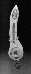 Narrative art since the 1960s has been highly personal and emotionally charged. Kathleen Browne's jewelry is embossed with captions and appropriated texts that add additional narrative meaning to her already suggestive figurative imagery. "Last summer the fruit hung ripe and full and loosened to the touch" is the caption for a succulent but ambiguous, figurative form bearing pendulous breasts of dangling baroque pearls. The interaction of language and form suggests a specific reading of the narrative. Browne draws upon Medieval reliquaries as a source of inspiration. Her text is stamped directly and clearly onto the surface of the metal, recalling the outer surfaces of reliquaries which are embellished with the lives of the saints. High Tide, for example is in the form of a sarcophagus, a container similar to an ossuary. The inside container of High Tide holds what appears to be the remains of the body referred to in the anecdote printed on the lid. The passage states: