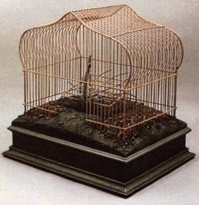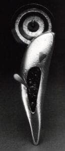 Bruce Metcalf employs the irony of caricature in his miniature vignettes. He structures his allegories in a conventional way, with subject, object, and verb interacting. The plot is on the surface and readily accessible, speaking directly to the angst of everyday existence. One of the roles of contemporary narrative is to reflect on the complexity and confusion of urban-industrial culture. Metcalf does this by appealing directly to our unconscious, touching our most basic fears and desires. His brooches are mirrors which reflect the stories of both the viewer's and the maker's anxieties of living in today's world. The artist hopes to balance these deeply felt and, as he terms them, more horrendous maladies of existence, such as death, pain, and alienation, with the absurdity of humor. Another aspect of narrative in Metcalf's work is suggested by his compositions, which are much like isolated frames from a film, with characters caught mid-motion, mid-action, midway through the plot. The fact that freeze frames are one of the most familiar ways that visual images refer to larger, more inclusive stories, allows Metcalf's allegories to speak directly and openly and in a language that is more easily understood.