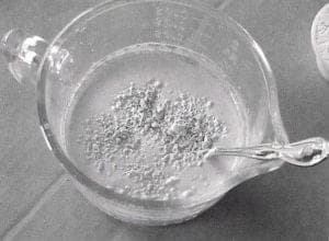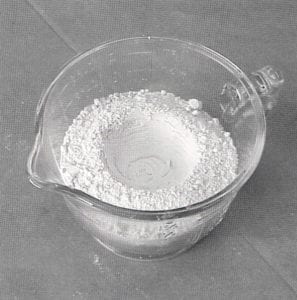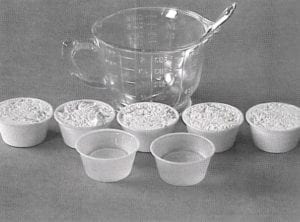 Since the powder contains a workable blend of glass, clay and electrolytes, only water needs to be added. The question is, how much? The amount varies some, but generally the water required ranges from 38 to 42 percent of the weight of the powder. Eight ounces of powder will require 85 to 95 milliliters of water for a workable mix (slip). Since some readers may not have a pound scale or a graduated cylinder in milliliters, we provide a rule of thumb. One container level full of water, between two and two and one half containers (same size container) level full of powder will produce a useable mix of most any industrial liquid enamel. If you would rather not judge when a container is half full, use two of water and five of powder; four will usually be required and frequently most of the fifth.