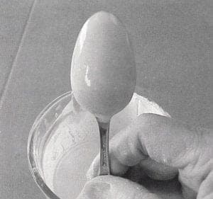 Again, the answer is easy; it can be done either way. First, the powder into the water. Figure 1 shows a set up (not necessarily the best). Put two containers of water into the measuring cup. Add the five containers of powder one at a time slowly while stirring the enamel. The powder should be scattered onto the entire surface of the water, not poured in one spot. At first, the powder disappears quickly, dispersing in the water and little stirring appears necessary. The electrolytes are being dissolved in the water, the rest of the powder, being insoluble, is being dispersed. Usually, as the second container is being added, powder will begin to float on top instead of being dispersed immediately, Figure 2. Hesitate a few seconds while it wets and sinks. You are in the process of wetting a few square miles of surface area. As you near the end of the third container, the waiting time for the powder to sink will test your patience and you will start stirring before it sinks. This results in a soft mass which disperses easily. You will soon notice the film on the spoon, when removed from the liquid, is different-it now has a fairly nice coat. This coat becomes thicker and more uniform as the fourth container is added. Perhaps near the end of the fourth container, the mix should be checked. Wash the spoon, dry it thoroughly, dip it into the mix, move it through the mix, then straight up and out with a continuous movement, holding it vertical while the enamel runs off, as in Figure 3. When draining has ceased, raise the spoon as shown in Figure 4. The coating should be smooth, and show no signs of beginning to drain again (second drain) after raising the spoon to the Figure 4 position. The ultimate test is to dip a small test piece, dry and fire.