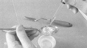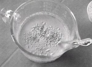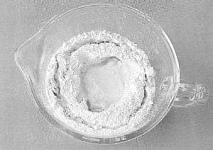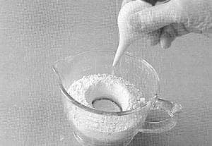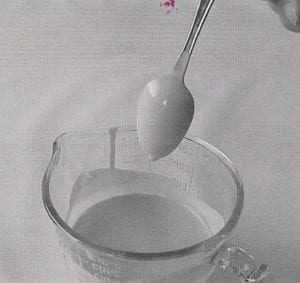 It may appear redundant to describe WATER INTO THE POWDER, however, there are some advantages, and happens to be the author's choice of methods. Place the powder (use the five container procedure, or be adventurous) into the mixing cup and make a small cavity in the center, Figure 6. The cavity shown was made with the large end of an ear syringe shown in Figure 7, being used to add water. Adding water in this manner provides more control than pouring from a coffee cup. Fill the cavity about half full, stop, and allow the water to soak into the powder. Add a little more water, again stop and give it time. Soon, there is an interesting erosion pattern. The water is forming its own container within the measuring cup, Figure 8. A palette knife is ideal for pulling the dry powder into the center without disturbing the wall of the inside container. Very little additional water will be required to make the entire top surface appear moist. Begin to stir with the palette knife, add a little water, check the thickness of the coating on the knife, and continuing until the desired coating thickness is obtained. Again, the last step is screening the enamel. The author prefers this method because it is easier to estimate how much powder might be needed for a project than the amount of water. Starting with a mix which is too thick, needing only water to make a workable material, is more reassuring than starting with one so thin and hoping you will have enough powder to arrive at a good product. Plus, this latter method is more versatile. Figure 9 shows a small amount being mixed in a table spoon.