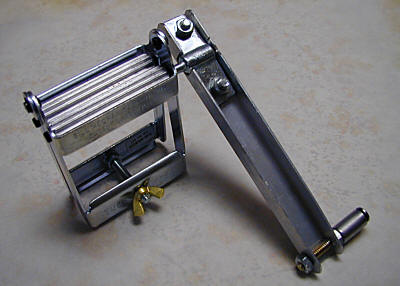 Chris center the handles of the Industrial Tube Wringer #401 then slipped in a bolt and secured the end with a wing nut. This enables tightening of the tool handle for increased pressure. To fabricate a larger handle, two holes were center drilled into each side of the tool turn lever. U shaped steel was cut to length desired to create a longer handle. The u shape steel wall is cut away and filed to accommodate the tool spindle of the lever. Two corresponding holes were drilled to match and align with those on those drilled on the tool handle. Corresponding holes are drilled in the opposite end of the u-shaped steel and a turn knob is fashioned using a nut, bolt and plastic knob.