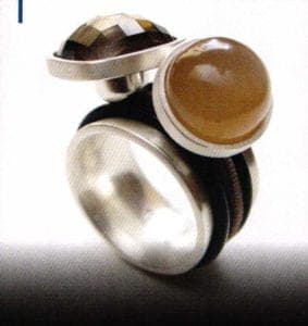 Ariane Hartmann, ring 'Change'. Sterling silver. Interchangeable ring head system. Beveled smoky quartz and moonstone, elasticated rubber straps