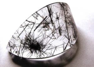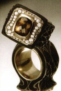 Jurgen Glaser, ring 'Earl'. Etched steel, 18 karat white gold, tourmaline, diamond