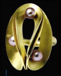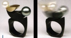 Michael Berger, kinetic ring. 18 karat yellow gold, plated stainless steel, freshwater pearl, Tahiti pearl