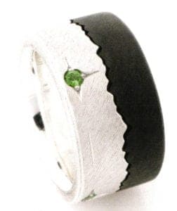 Steffen Lang, beach ring. Steel, sterling silver, green garnets