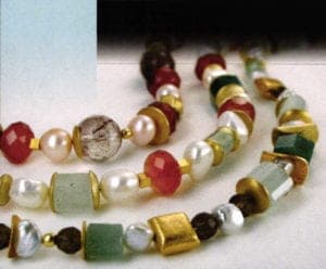 b.fine, chains. Carnelian, smoky quartz, aquamarine, freshwater pearls, Keshi pearls and silver components plated in pure gold (thickness: 10 my)