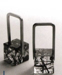 Marcio Nonato, 'Geometric' collection. Romboedric stones. Bottom row (from left to right): Onyx, tourmaline quartz, rose quartz. Second row: Lemon quartz, amethyst. Top: Quartz