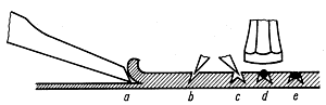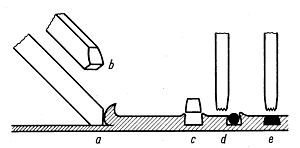 | 10.19 Inlay with chiseled groove a - chisel cut, side view b - chisel cut c - chiseled groove d- tapping down the ridge e- hammered inlay completed |