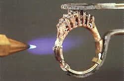 Firecoat the ring. Flux the joints and place a snippet of solder on one side of one of the seams (they will be soldered one at a time). Warm the entire ring very slowly to avoid shocking the diamonds. When the solder begins to melt, apply heat on the side opposite where you placed the solder in order to pull it completely through the scam. Be sure you see solder on all sides of the seam, and if needed, add more at the same point and reheat. In this way you can be certain that the solder flows completely through the seam. After re-checking the position of the components on the soldered side and the alignment on the unsoldered side, proceed to solder the second scam (Figure 13.3).