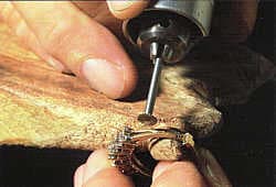 File the joints and carefully blend the contour of the new shank to match the ring. Since a file will not fit into the groove of the shank's pattern, use a knifeedge bur to carve the contour. It is important to secure the work firmly to prevent slipping, so hold the ring from below and pull it against the bench pin. Plant both hands, one holding the ring, the other the tool. Lubricate the bur with wax or oil and use it at a slow speed, just fast enough to prevent grabbing. Burs like this are sharp and aggressive, so use a light touch, stroking the spinning bur against its rotation in a smooth even motion. With each pass, lightly scrape the surface of the metal, until the desired shape is reached (Figure 13-5).