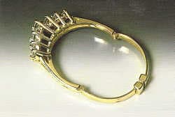 The fact is that as we age, our hands and fingers change shape, as do other parts of our anatomy. Whether due to injury, arthritis or just getting older, knuckles usually become larger which makes rings more difficult to get on and off. Suppliers offer several different mechanisms designed specifically for this type of situation. Ping mechanisms can be ordered in a range of meta-Is, styles, widths, sizes and even with different ways of opening. Some work like bracelets, with a hinge and a clasp, while others have a sliding mechanism like the Adjusto Shank@ which opens up to a larger size yet cannot open completely, thus preventing accidental loss. (Note: This chapter documents only the work on the ring shank, which was completed prior to the setting repair.)