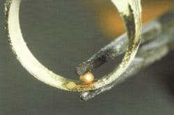 In order to accommodate the addition of two small balls and still fit the wearer, the ring should be enlarged by about one quarter of a size. This can often be accomplished merely by hammering the shank just a little bit. Examine the ring to determine if it has been sized before. If it has been sized, and there are seams in the shank, then it would be wise to use easy solder to attach the balls. If not, medium or hard solder will work well. Place a snippet of solder on the flat spot where each ball sat on the charcoal block. If there is no flat spot, make one by filing. Heat to flow the solder. The two-stage process of flowing solder onto one element prior to joining it with another is called sweat soldering (Figure 7.3).
