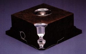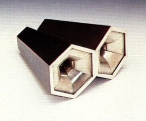 Mimlitsch Gray's hollowware series is one of her most challenging. Layer upon layer of visual experience is coupled with the social and domestic resonance of the chosen objects. In this series, salt cellars, bowls, teapots, and decanters are enclosed in both plain, nondescript boxy structures or in slightly curvilinear fabrications. Some of the encased vessels are found objects produced by industry, while others are reproductions of traditional vessels handmade by the artist. Each vessel is divided (sliced) in either halves or in variously sized segments. The viewer is left with a silhouette of a common object which flattens the representation. The encasement denies an ordinary visual experience of viewing the convex surfaces of volumetric form, and exhibits instead the recessed spaces of the interior of the containers. One comes to know such common vessels for the first time by their interior reality.