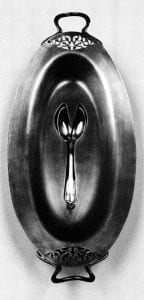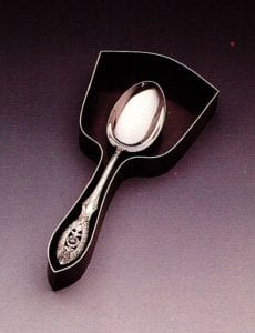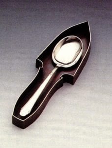 Issues concerning domestic roles are further explored in shadow boxes. The artist does not just call to mind the table as social setting; rather, her arrangements incorporate the special cloth sheaths and storage boxes used to house silver tableware when it is not being used. The elaborateness of these storage structures directly raises issues of wealth and prestige. One piece uses a box-like form in the silhouette shape of a hand mirror. The spoon is centered with the concave surface of the bowl occupying the same location where a face would be reflected.