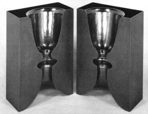 Isolated pieces focus on a particular subject and can be quite Dadaesque in nature, taking a revealing and yet defiant tone, as compared to the relative simplicity and elegance of the work in series. One such object is Heels. Deceptively simple, this pieces is layered with histories and innuendoes that engage questions of gender conditions in the late twentieth century. Two stiletto heels lay together with corkscrews jutting out from the surface where the heel would normally adjoin the sole. Semi-precious stones are set at the tip of each heel. Perhaps a screw is needed to keep the impossibly tilted appendages attaches, or one could unscrew them and take them off the shoe. Mimlitsch Gray may be saying that a woman may be feminine in heels, if she wishes, but that they do not describe or define her, that she is now free to take her rightful place on the level ground, off the unrealistic pedestal of shallow praise and social expectation.