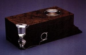 In Encased Teapot, 1991 Mimlitsch Gray takes a manufactured teapot and places it inside a handmade box. She highlights the contrast between the austere design of a traditional Shaker object and the sumptuous shape of the teapot and the industrial processes which mass produced it and so many other duplicate forms. The Salt Cellars reflect the process of their manufacture as mold-made, machine-punched volumes. In standard industrially-produced cellars, the separate halves are joined during manufacture. Mimlistch Gray presents both mold and form to the viewers. These positive and negative shapes force a consideration of both the production process and the traditional use of such containers.