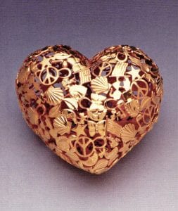 Mimlitsch Gray evokes and mimics the 1970s when she uses found spoons as jewelry. During that period, sterling flatware was cut and bent into rings and bracelets; though, her heart shaped spoon and neckpiece, for instance, are almost too lovely to be thought of as part of that heritage. Aside from nostalgia, the artist's use of sentiment is more fully, even blatantly realized with the brief, concurrent series which she refers to as Baubles. The large heart-shaped Purge and Ring II, are tight, hollow constructions of tiny profiles of stars, horses, moons, and flags, all mass-produced in brass. Mimlitsch Gray refers to these as "images of Americana". Gold-plating creates a more precious object, imbuing a cute item with a deeper beauty. Yet, the beautiful heart, which would be perfect for Valentine's day or Mother's Day, is too large to be wearable, and it has no pin-back either, which diminishes the possibility of wearing this token of affection.