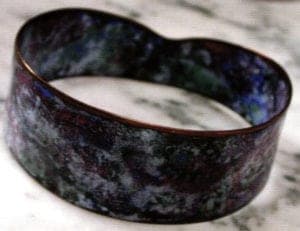 Finally I wish to ask the readers' attention for the works by Jan Matthesius and Pauline Barendse who enamel on titanium. They worked together in developing the enameling technique on this material which is not often used for enameling. at least not here in the Netherlands. The designs are contemporary and crisp and show excellent craftsmanship. This work seems to me to be trend-setting. (Other enamelers who are interested in enameling on titanium, may consult the Thompson Enamel Workbook, under 'Metals suitable for enameling', page 15. )