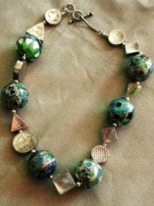 I'd like to illustrate this remark by a few words about the variations in necklaces of which there were many on show. Vladimir Malkin, born in Russia but living in the USA, showed beautiful necklaces and earrings, which combine graceful designs in silver with stunning enamels on copper, Edmund Massow (Germany) shows his skills through enameled beads and hollow forms. And even in the two necklaces he sent in there is an enormous difference. One shows a combination of round cloisonné beads and other silver shapes, enameled in various colors, the other consists of shapes in black, matted cloisonné.
