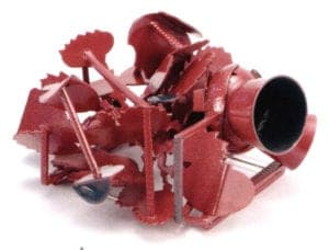 The 'Red Machine' brooch by Helen Britton is made of silver and paint and is 70x50x30 mm in size