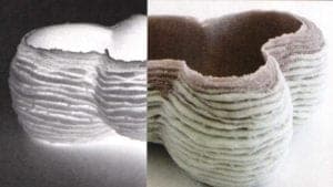 The ceramic bowls by Japanese artist Yoshimi Futamura, now based in Paris, are reminiscent of tree bark or a loaf of bread. The artist combines sound and porcelain in her works, covering the surfaces with an ash glaze