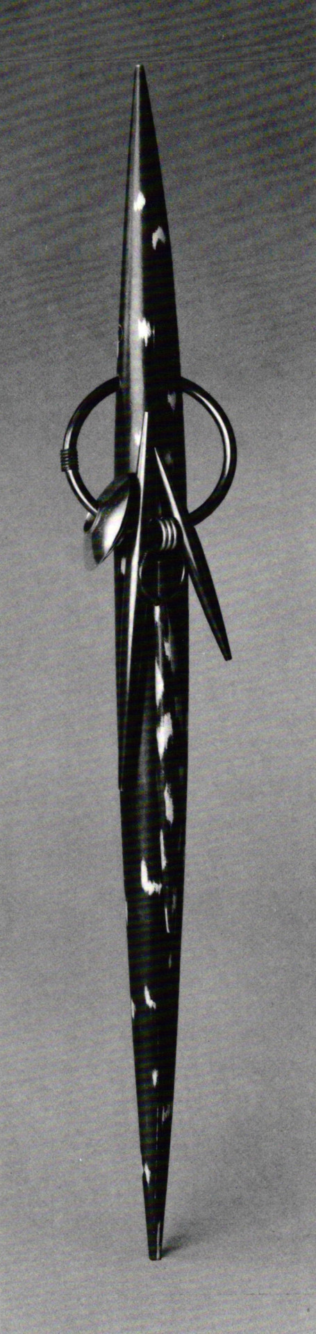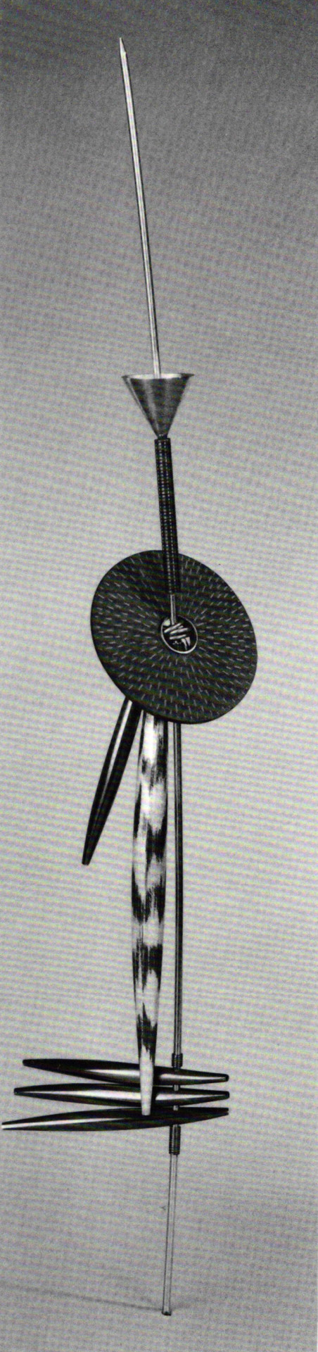 At 9½" in flat diameter, the overall form of these bracelets takes on the super scale we have previously encountered in the recent linear pins. But upon, the tiger stripes and the inevitable jungle associations, a new referent is introduced—tribal modes of body adornment. Repetition, seen clearly here in circles and tapered spikes, is a frequent factor in primitive jewelry. Once again, the very basic sexual nature of these forms cannot be denied. They remind us that the very wearing of jewelry (in more than just tribal worlds) is frequently a means of transmitting sexual messages—availability, status, prowess, accomplishment, in addition to the obvious attempt to seduce. But there is more. Raised up on the tubular tips, the artist's preferred installation, these bracelets suggest the controlled energy of an animal poised to strike. Inherent tension, indeed, impending danger are implied. Not only do they at first seem dangerous to wear, but they are dangerous for anyone who gets too close. The implications of spikes, daggers. Spears and the slate shields all allude to the weapons employed by a battling tribal people. Those battles pit man against man, against beast, against woman. And so the bracelets take us full circle, back to the universal sexual struggle; pulsing visually, pulsing sexually. These bracelets with all their physical and psychological weaponry are truly dramatic sexual statements.