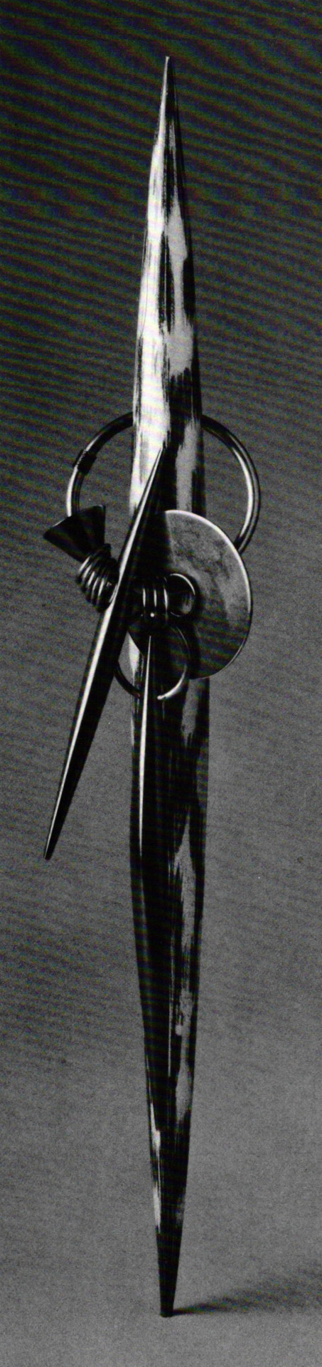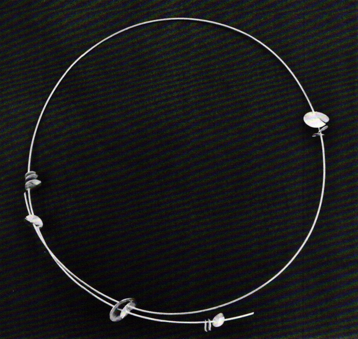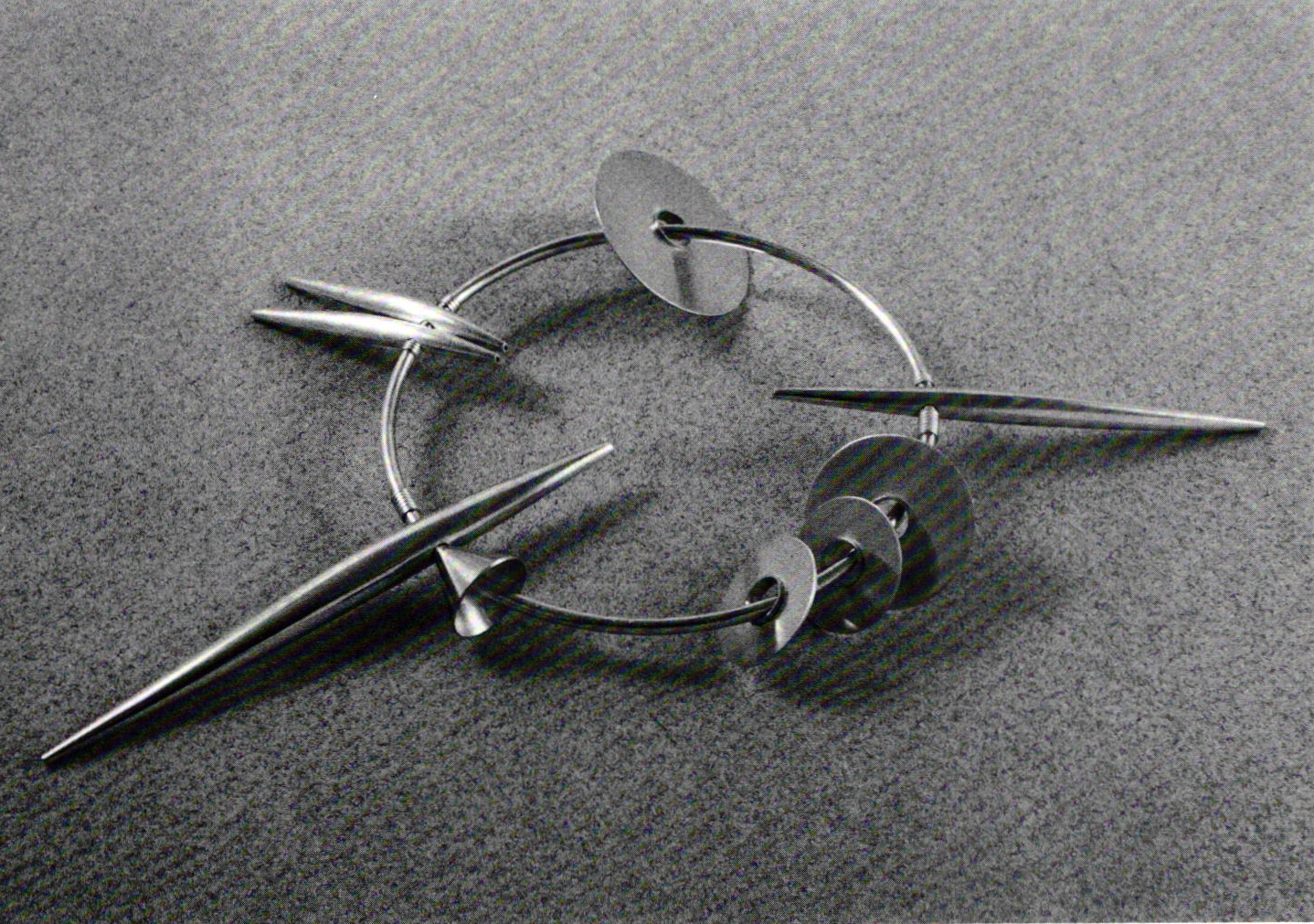 The series of pieces that utilize slit and bent disks on wire supports are an exciting light-utilizing statement. The formal elements are, again, exceedingly simple. It is their use that is sophisticated. For Thiewes has created a disk whose surface and edge have been repeatedly angled and manipulated to maximize their ability to reflect light. Worn against a stark ground, they can at first deceive the viewer into thinking that there is a clear refracting stone within the composition. Only on closer inspection do we learn that the sparkling effect was created with metal alone.