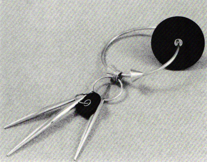 With time, this format has grown steadily bolder. The delicate wire support has given way to a thick yet graceful spiculum, which is drilled to accept a circular support of form from which dangle the usual array of carefully proportioned geometry—disks of metal and slate, other circles, spicula. At 9″ long, they no longer provide discreet addenda to the outfit. Worn across the chest, they are the outfit. They are the first thing seen—they greet the viewer aggressively—they expand the wearer's presence and dramatically signal the wearer's individuality. If they are worn diagonally by a woman, they emphasize the breast at the same time that they echo it. These pieces have grown to take center stage—they are over-scaled and daggerlike in their silhouette. They stab and they grab your attention—they are riveting!