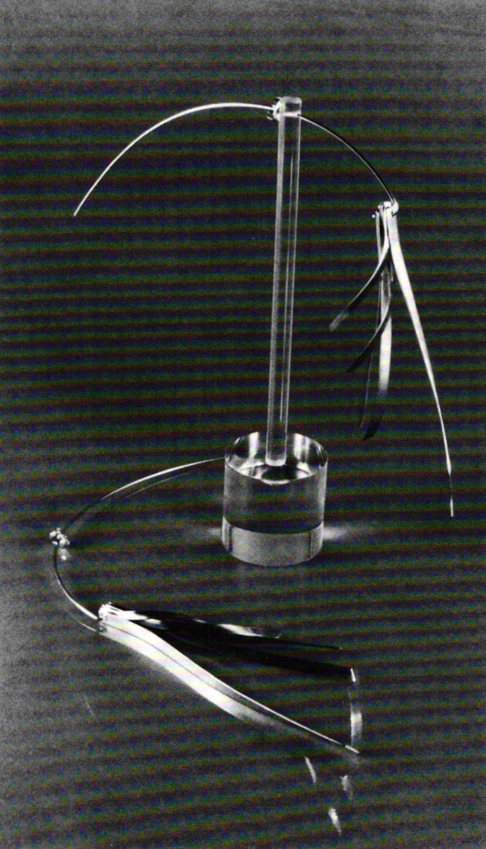 The term kinetic art has been applied to everything from work that depicts movement to work that provides violent retinal stimulation. But in Thiewes's work, it describes three-dimensional form whose elements are capable of unpredictable animation. Alexander Calder, who began constructing mobiles in 1932, is perhaps the most brilliant exponent of the genre and certainly relevant to this discussion. His aerial constructions suspend abstract compositions on a filamentlike backbone, from which flow a series of wire cantilevers. The balance is engineered so that the slightest shift in air current can set the elements in motion. An elegant Thiewes earring from 1982 pays homage to the Caldervision. In her piece, a group of slender, petal-like forms are pierced and suspended from the exaggerated curve of an arched earwire. Made to dangle from a plexiglass stand when not in use, the earring echoes the grace of Calder's mobiles, in minature. But, while Calder's work is free to answer only to his esthetic intention, the sculptural jewelry of Thiewes is bound by its need to perform. In answering this need Thiewes expands the notion of kinesis to fulfill another of her own intentions, that of creating form that functions as "an extension of one's physical self."