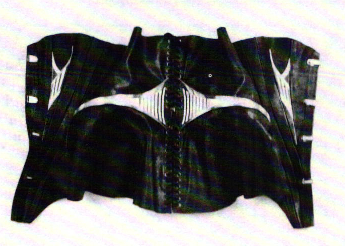 For her thesis work. Thiewes created an ambitious multimedia torso form, a corset or bustier. One of the two variations was fabricated of steel, brass, ivory and leather. As an aside, it is worth noting that this early piece transformed the wearer into a performer. The piece took 40 minutes to get into, while the materials made it even more difficult to endure. It was costume rather than jewelry. But more to the point, this piece was sexually evocative. Owing its form to a woman's Victorian undergarment, its rear lacing and front metal hooks suggest all the constriction and repression symbolized by that period. The lacing, the metal and the fact that the bodice is of leather suggest the deviant sexuality that is frequently the product of such repression.