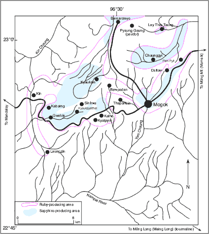 | Figure 3. Map of the sapphire-producing regions of Burma's Mogok Stone Tract. Modified by R.W. Hughes from Halfor-Watkins, 1935b. |
