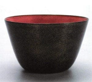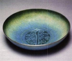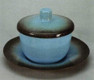 At one of the guild meetings, Carlton Ball gave a workshop in enameling. It was there that Jade Snow began her lifelong fascination with the medium. However, since copper was scarce during World War II, she was not able to give full scope to her vision until the conclusion of the War. In her earliest known works, she raised her own forms starting with a copper sheet, bent, shaped and hammered to become the desired vessel. As with her ceramics, the shapes were strong and solid, the enameling simple, spare and refined.