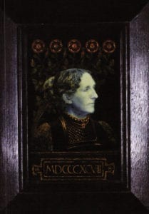 Catalogues for the Aberdeen Artists Society exhibitions, held each year in Aberdeen Art Gallery, record that Watt exhibited some 29 enamel plaques between 1900 and 1921. A small, rather eclectic, group of plaques was bequeathed to the Art Gallery's collections, including a portrait of his mother, presumably a memorial plaque, dated 1898, and is possibly his first portrait. The colors of her dress are deep and rich and she wears around her neck a red enameled pendant, undoubtedly Watt's craftsmanship. The slightly asymmetrical heart shape with floral motif is a theme that recurs frequently in his work. It is likely that this portrait is based on a photograph, but not a photo-transfer. The composition of the rose bush suggests that it may have been one of a pair (the other possibly of his father) but I have found no record of second partner portrait.