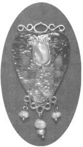 One brooch of Watt's shows something of a Celtic inspiration. Triangular in form and set with amethyst carbuncle stones at each point, it has a central pearl set in a garland of blue enamel and granulation. The Celtic feel is reinforced by the setting of stones at each point, a typical Celtic design feature. But elsewhere there is little evidence of the other Celtic design motifs - geometric and linear knots or interlacing.