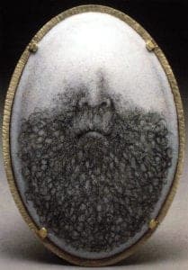 Once finding an image I want to work with, the beginning is loosely sketched with a ceramic underglaze pencil (oxide, no glass) on an etched enamel ground. Blending stumps and wooden scribes are used to blend and create subtle gradations with the pencil. many of the basic drawing tools are suitable for work with oxides in enamel. The enamel surface, unlike paper, has little tooth, so the surface becomes saturated very quickly. Care must be taken not to rub your hand across your drawing, because you will lose a lot of your work. The piece is then fired to set the drawing in the enamel surface. The pencil will fire partially matte, because there is no glass in the underglaze.