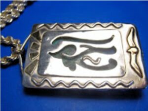 Hearing his comments made me even more determined to attempt the reversible concept. At first, I had quite a few ugly, half-melted disasters. One of the first reversible designs I was proud of was a piece from a series inspired by Egyptian hieroglyphs. It was a sterling silver pendant with the Eye of Horus pierced out from the back exposing the blue-green color of the chrysocolla cab I had cut.