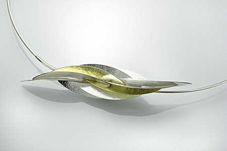Redman snips off the bayonette clasp and inserts one side of the coil into the male component of a friction tube clasp, also supplied by Rio Grande. Since the palm pendant comprises five interlocking shapes that slip onto a piece of tubing, the palm itself acts as the female end of the clasp. "The tubing on the pendant is crimped onto the other end of the coil," says Redman. "When the coil is clasped around the neck, the closure flows into the design, creating a seamless look."