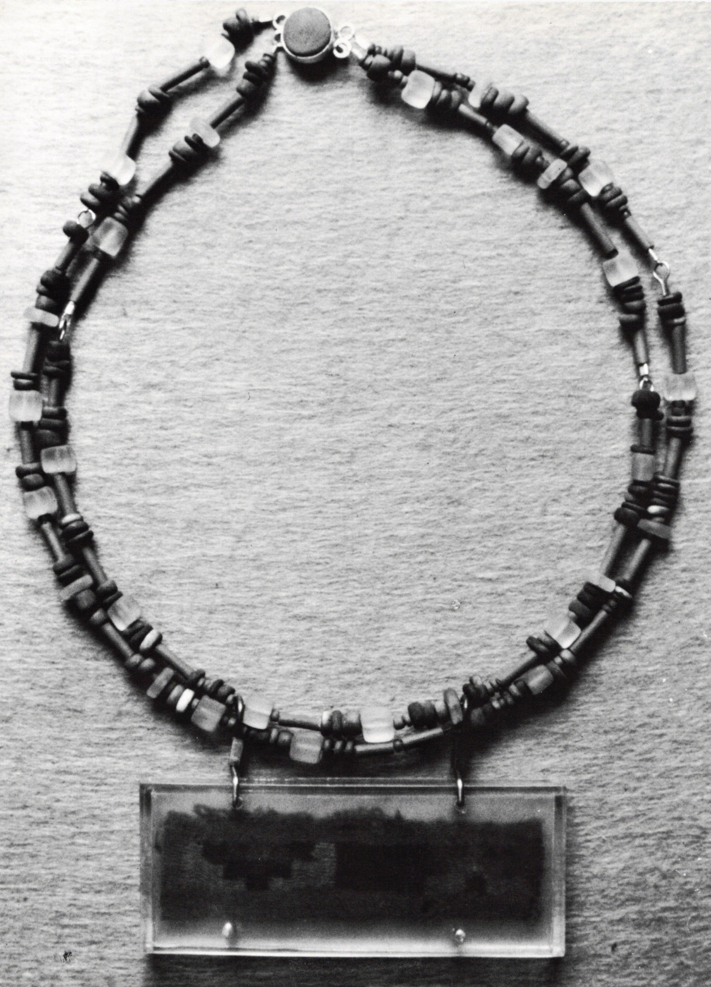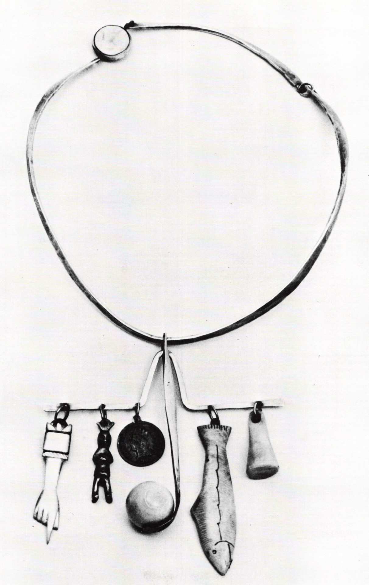 The necklace is Solberg's chosen form of jewelry—it is the one form, enclosed or circular, which is repeated again and again in her oeuvre. Abounding with symbols and cultural artifacts, the necklaces are contemporary talismans, carrying contemporary myths. One necklace, made in 1968, suspends from a simple structure several small objects: a bit of Alaskan ivory, a stylized silver fish, a small totemic figure, a pointing hand and an old coin bearing the image of an Indian. Its title, Shaman's Necklace, refers to the magical medicine man of the Northwest Indian. Another necklace, strung with ancient beads and bearing a pre-Columbian textile fragment, which is sealed within acrylic, is titled Craftsman's Amulet. Titles such as these emphasize Solberg's sense of history and her emotional connection with the primitive artist. Unlike today, the primitive artist was an integral part of his community; he was even endowed with great power. The shaman's fetishes were feared and treasured; amulets and talismans could bear great potency. There was nothing frivolous or vain, or even pretty, about many of these objects; they contained the magic, superstition and the myth that for the primitive explained the terror and vulnerability of his life.