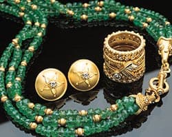 These days, when Heinrich composes a necklace, she sorts through mandarin garnets, eggplant spinels, and purple sapphires. Over 150 colored stones, canoe-shaped to kite-shaped, await framing in gold and platinum "martini" bezels, channel sets, and "pillow" shanks. When technical mastery meets metal and brilliant stones in her studio, the result is a high-carat opera whose chorus is gold, diamonds hit the high notes, and colored stones are the featured players. When jewelry feels like music, it is unmistakably a Heinrich design.